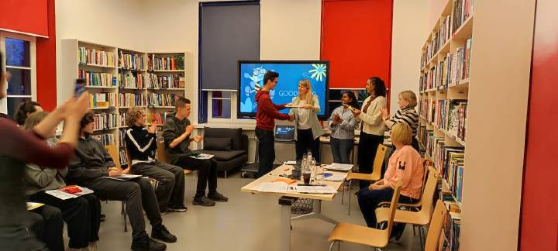AY 2025-2026 Fulbright ETA, Amina West (the third from the right) served as a judge at the English Spelling Bee 2025 at the USA Information Center in Daugavpils